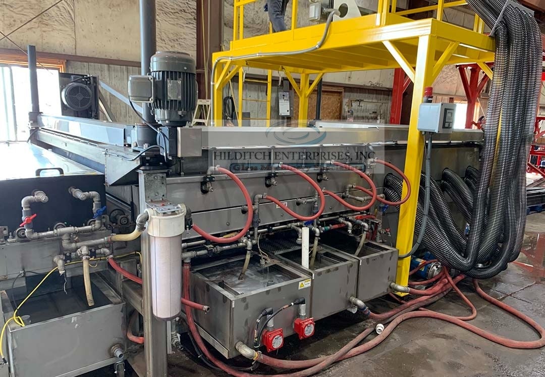 Comments: This is a stainless steel glass washer. Available immediately. Washer has lowE Brushes. This washer is equipped with pre-spray section with two top spray bars and water tank with recirculating pump and carbon filter. Wash section equipped with three water tanks and first water tank is heated. Drying section has a new 50 HP drying fan and motor. Washing /Drying sections equipped with screw -jack lifting system for easy maintenance.